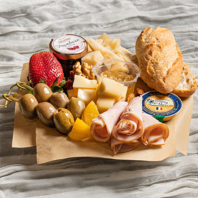 A breakfast platter featuring Emmental and Gouda, paired with smoked turkey, fresh fruits and nuts, and served with jam, honey, and butter — simple, comforting, and perfect to start the day.