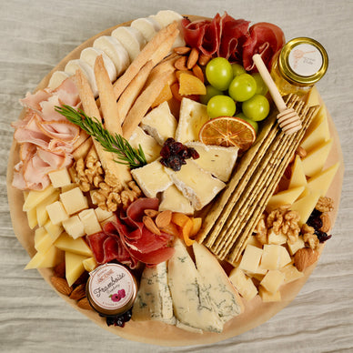 A fresh, elegant board featuring soft and semi-hard cheeses, creamy brie and blue cheese, light cured meats, crisp crackers, honey, nuts, and fresh grapes — bright, balanced, and ideal with whites.
