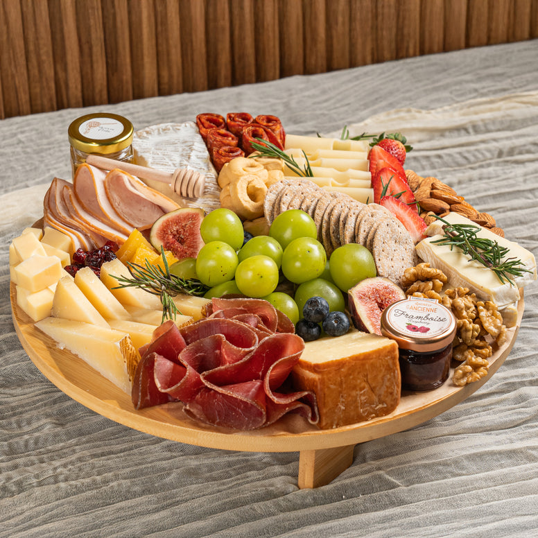 A generous platter for 2 to 4 people, featuring Brie, Emmental, Chèvre, smoked Cheddar, and Manchego Curado, paired with bresaola, Spianata, and smoked turkey, complemented by fresh fruits and mixed nuts, and finished with crackers, jam, and honey.