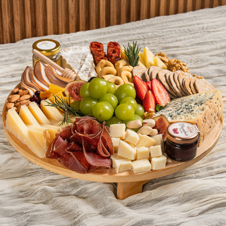 A refined platter featuring Brie de Meaux, Comté 18-month, Manchego Curado, blue cheese, and Gruyère, paired with bresaola, Salami Milano, and Spianata. Complemented by fresh fruits and mixed nuts, crackers, and finished with honeycomb and artisan jam for a beautifully balanced experience.