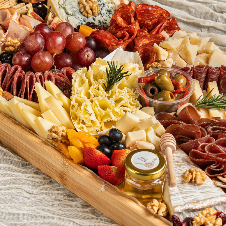 A refined platter featuring Brie de Meaux, Comté 18-month, Manchego Curado, Roquefort, Parmesan 12-month, Gruyère, and Tête de Moine, paired with bresaola, Spianata, smoked turkey, and Salami Milano. Completed with fresh fruits and mixed nuts, crackers, and honeycomb with artisan jam for a perfectly balanced tasting experience.