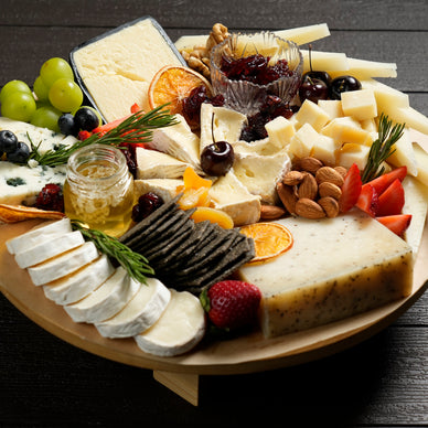 An elegant artisan cheese board featuring a variety of soft, semi-hard, aged, and truffle cheese, paired with fresh grapes and berries, honey, dried fruits, mixed nuts, and crisp crackers — perfectly balanced for a refined, meat-free experience